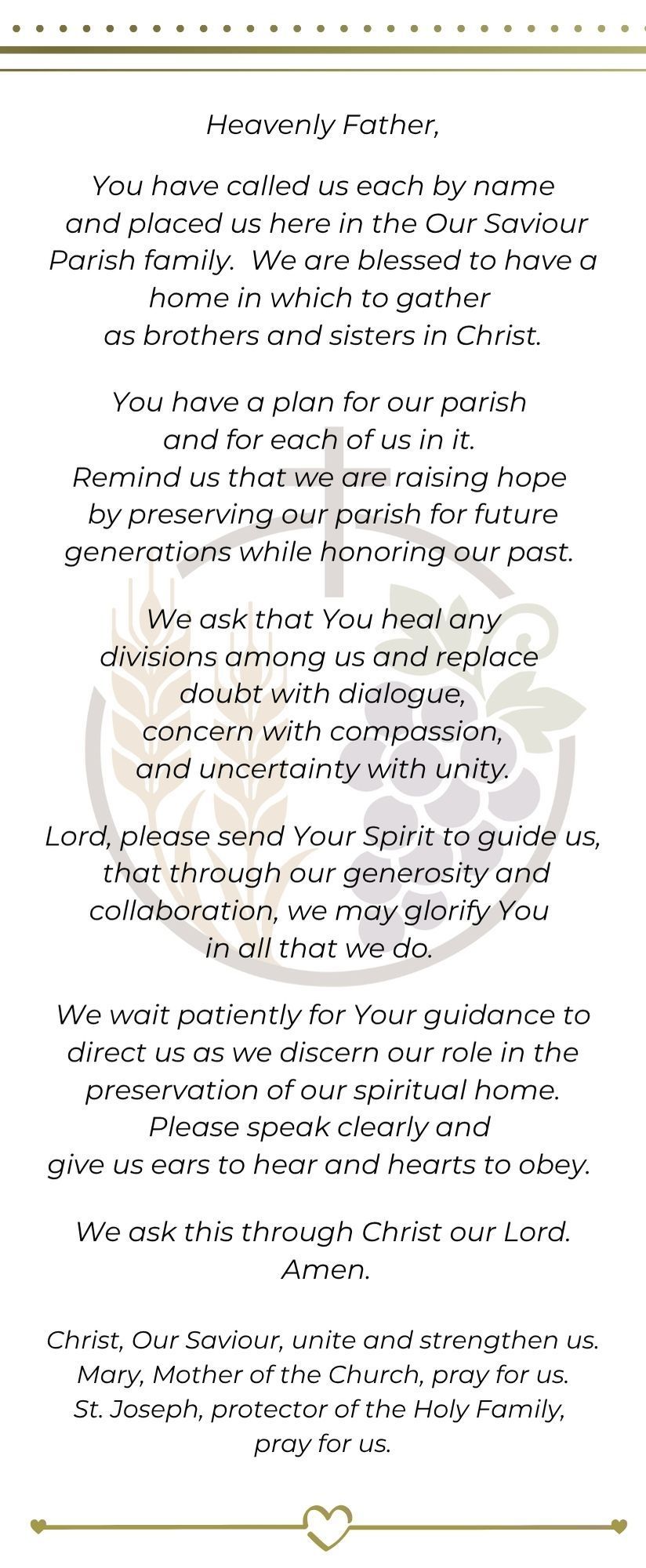 We are a welcoming Catholic community called by God to live out the message of Christ in love and service to all people. Our parish mission is: